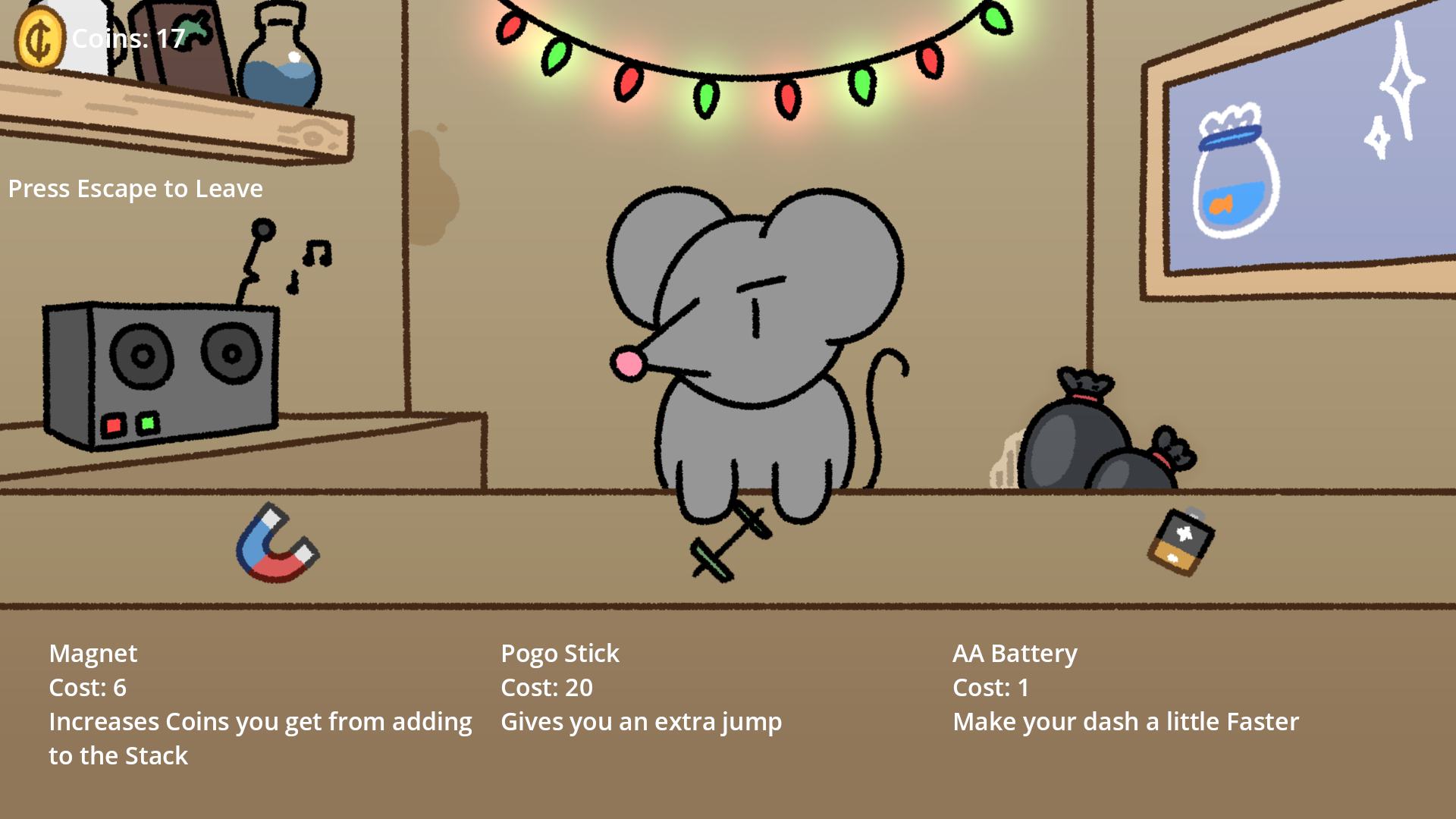 Help out little Jamie the Raccoon to achieve their lifelong dream of being on the moon! After buying a mysterious magical box that constantly creates new items, use these random items you dig up to climb as high as you can, while also buying trinkets from Talkin' Tony to help you climb better!