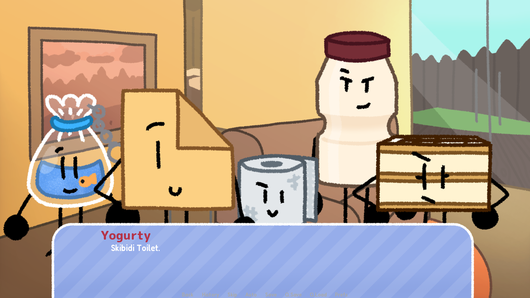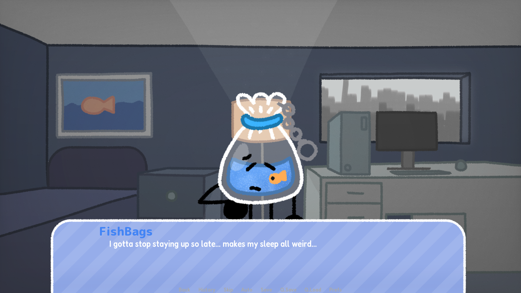 A visual novel that centers around the Fishbag Trinket named Fishbags! (Note not real fish inside). As they struggle for like- I dunno 20 minutes about their motivation, learning to finally start their project!